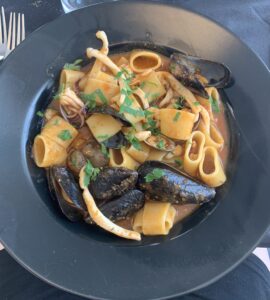 Après 40 minutes de route, nous arrivons dans la petite ville de Noto et il fait chaud, très très chaud (30 degrès avant midi). C’est une ville baroque, reconnaissable par son architecture en pierre calcaire dorée. Après avoir trouvé, non sans peine, une place dans un des parkings de la ville, nous partons découvrir la ville à pied. Nous prenons le porte-bébé car il y a beaucoup d’escaliers et peu de trottoirs. Après avoir visiter les principales églises de la ville, assez rapidement à cause de la chaleur, nous trouvons un bar pour pouvoir donner à manger à notre fille. Nous décidons ensuite de partir pour le bord de mer à 10km de la ville. Nous trouvons un petit restaurant pour manger des paccheri aux fruits de mer : un délice!